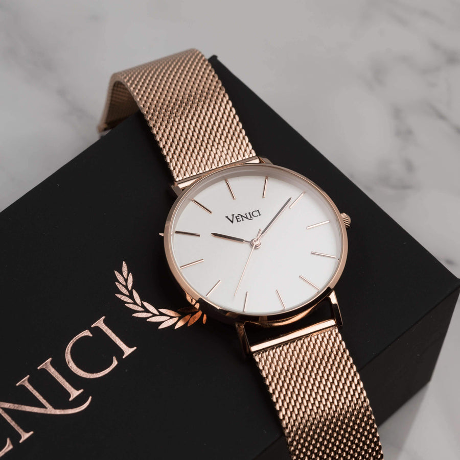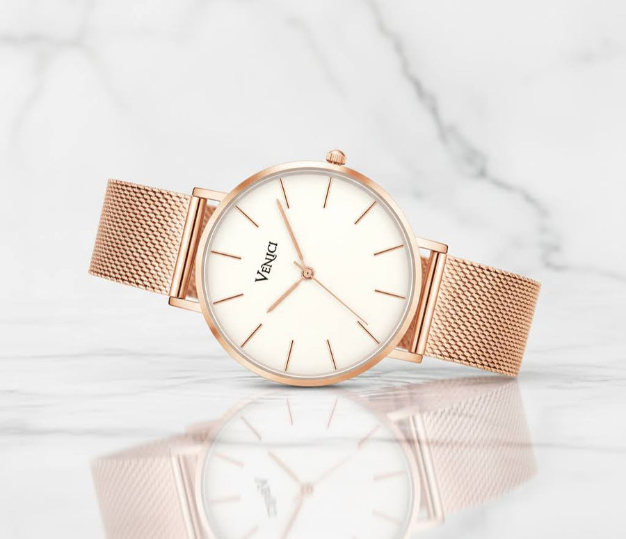 Athena stands as a testament to refined femininity — a rose gold timepiece elevated by its soft eggshell white dial and minimalist design philosophy. With its luxurious rose gold case, ultra-thin 36mm profile, and adjustable stainless steel mesh strap, this elegant women's watch blends timeless sophistication with everyday versatility, designed for those who appreciate understated luxury and effortless style.