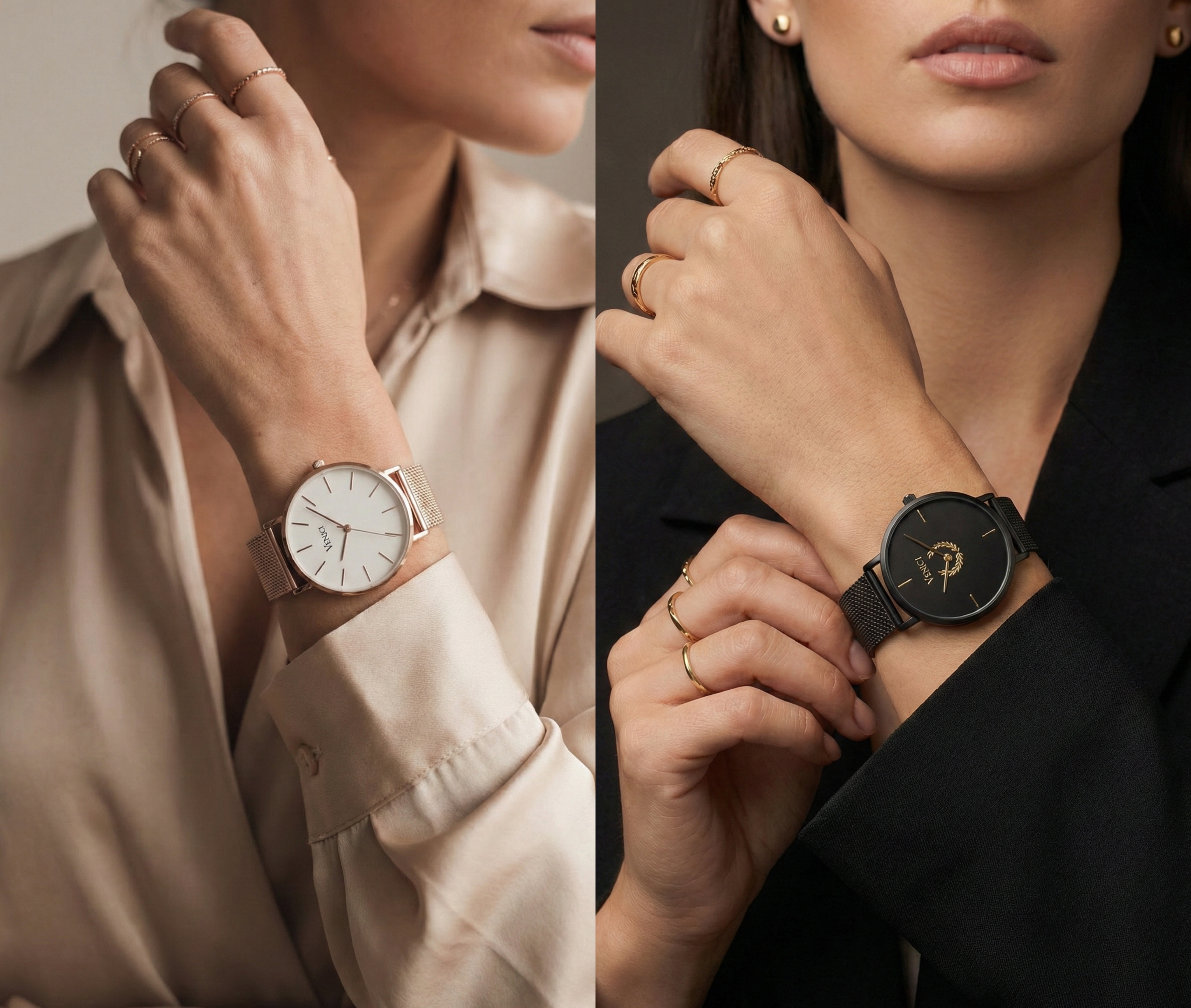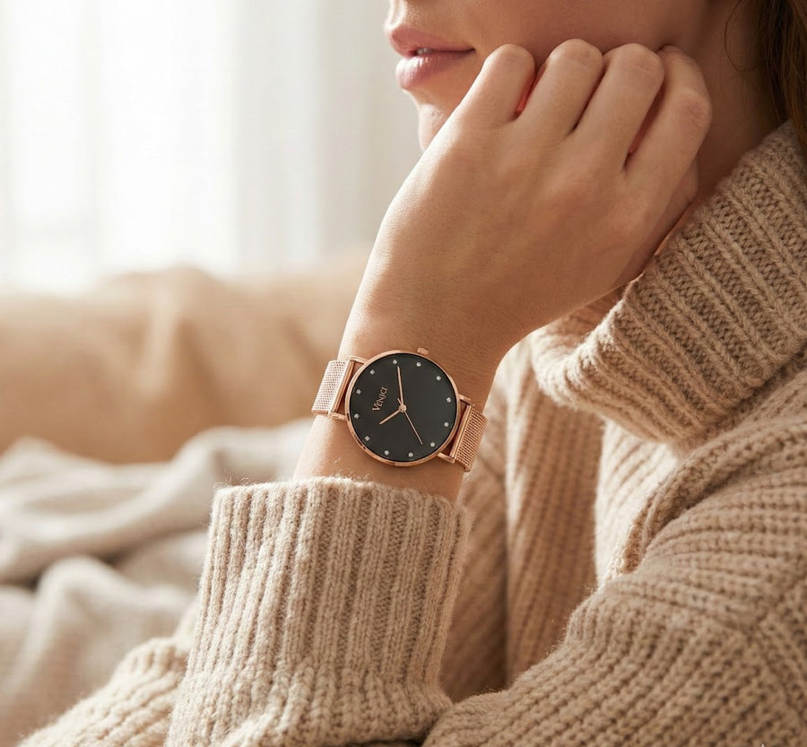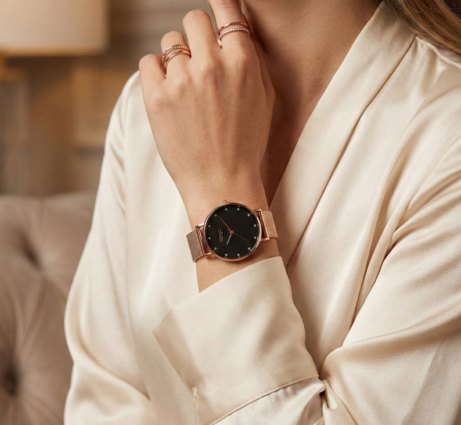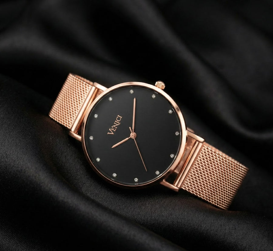 Medusa captivates without asking — a luminous rose gold women's watch elevated by a crystal-accented black dial and the kind of bold sophistication that turns heads effortlessly. With its luxurious all-rose-gold aesthetic, striking black-and-gold contrast, and adjustable rose gold stainless steel mesh strap, this statement dress watch blends glamorous elegance with modern confidence, designed for women who command attention simply by entering the room.